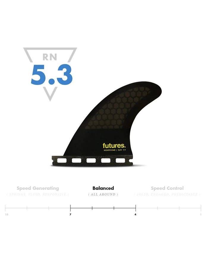 The QD2 4.0 Honeycomb is a medium size quad rear with a Ride Number of 5.3. Looking to turn your favorite Thruster set into a Quad? This pair of Quad Rears can be combined with any Futures front fins to suit your riding preference, board design and waves. With a symmetrical foil, these rears cater to fluid rail to rail surfing and speed. They will favor boards that have the rear boxes set off the rail, closer to the stringer.