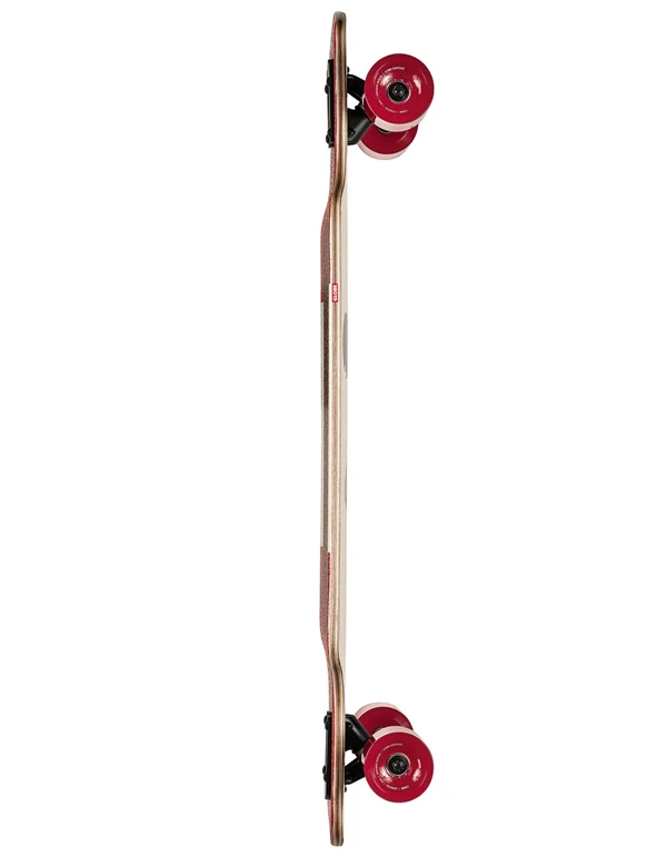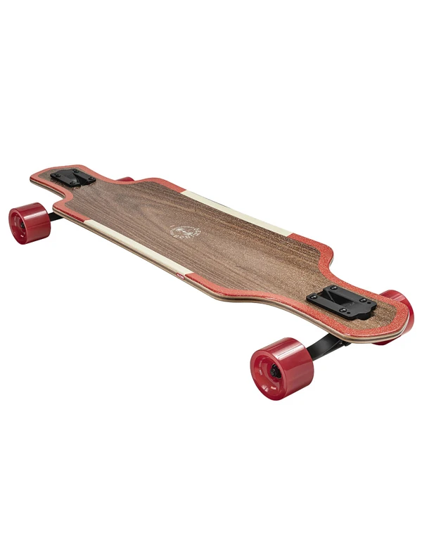 The Geminon 35 in colour Walnut/Cockatoo comes in size 35″ x 9″ x 24.75″wb. Symmetrical cut away longboard with drop-through trucks. It is a Slight side-to-side concave made of Walnut + hard rock maple. It features 180mm Slant reverse kingpin trucks and 70mm 83a Conical Cruiser wheels. Clear broadcast grip.
