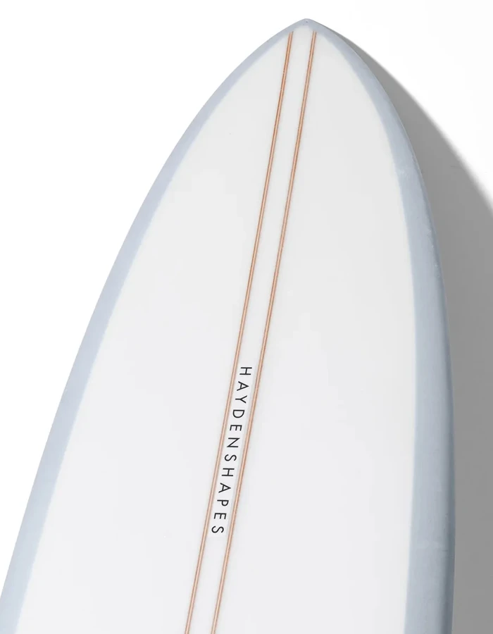 “This style of shape was a request from Craig earlier in 2020, to surf in average waves – as well as on the bigger days whilst being stuck at home. Its flatter rocker makes it a really great paddler; able to catch almost anything” – Hayden