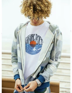 Overdyed loose weave 140g, cotton jersey surf graphic t-shirt with front screen print. Contrast colorful collar and hem. 100%CO