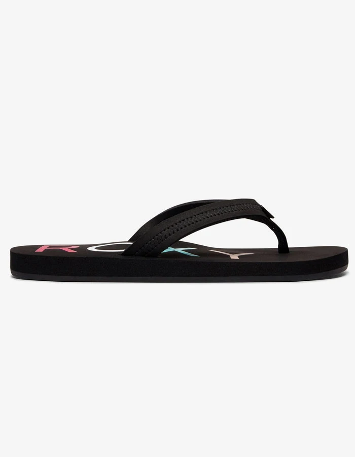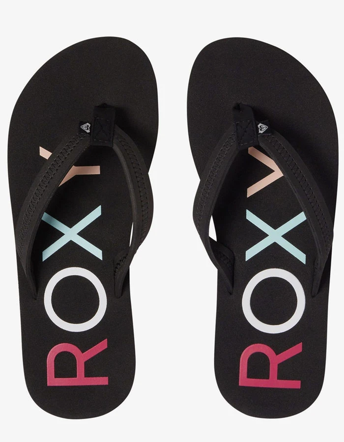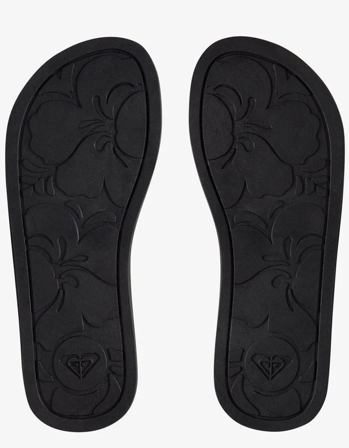 Upper: Water friendly EVA with polyweb lined synthetic nubuck toe post and woven ROXY logo flag label